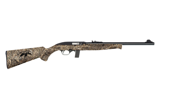There are 11 different guns in the Mossberg Duck Commander series of rifles and shotguns, including the Mossberg 500 shotgun, the 535 ATS shotgun, the 835 Ulti-Mag shotgun, the FLEX shotgun, the 930 shotgun, the 935 Magnum shotgun, the SA-20 shotgun, the 500 Super Bantam shotgun, the 715P Rimfire pistol, the 702 Plinkster Rimfire rifle, and the 715T Autoloading Rimfire rifle. Each gun has the Duck Commander logo, as well as Realtree Max-5 camo, Truglo Tru-Bead fiber optic sight (for the shotguns), and an American flag bandana.