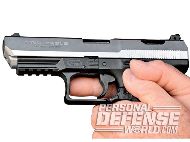 From the onset, it was intended that Magnum Research would eventually make the P99-based MR9 a Desert Eagle-style pistol to capitalize on the design’s recognition, and to keep the MR9 from being regarded as an American version of the P99. This required making some minor but noteworthy changes to the gun’s well-recognized exterior. The new MR9 has slightly larger dimensions than the P99, starting with the longer slide and that distinctive Desert Eagle muzzle, a 0.48-inch-longer barrel and an elongated triggerguard. The MR9 measures 7.63 inches in overall length, 5.3 inches in height and 1.3 inches in maximum width. With a barrel length of 4.5 inches and a longer slide, the MR9 weighs in at 24.8 ounces unloaded. Compared to a P99, it is 2 ounces heavier and 0.41 inches longer. The width and height remain the same.