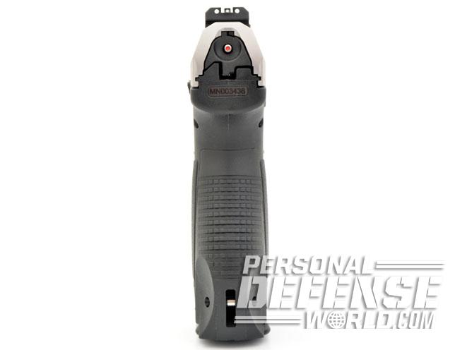 The white-dot rear sight is adjustable for windage and the MR9 comes with six interchangeable white-dot front sights of various heights, so the gun can be fine-tuned to specific ammunition and POA at predetermined ranges. The standard backstrap will fill most hands, and there are two interchangeable panels suitable for smaller or larger hands, or for when the operator is wearing gloves.