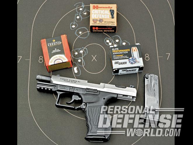 Test ammo choices were all personal defense loads. These included Hornady’s Critical Defense 115-grain FTX, Federal’s Premium Personal Defense 124 grain Hydra-Shok JHP and Sig Sauer’s Elite Performance V-Crown 124-grain JHP. From the MR9’s 4.5-inch barrel, velocities were 1,190 feet per second (fps) with Hornady, 1,083 fps with Federal while Sig clocked a 1,117 fps average.