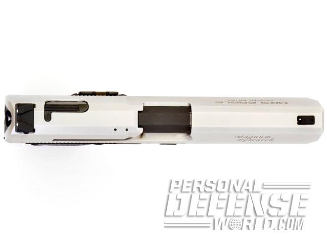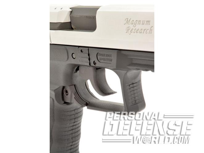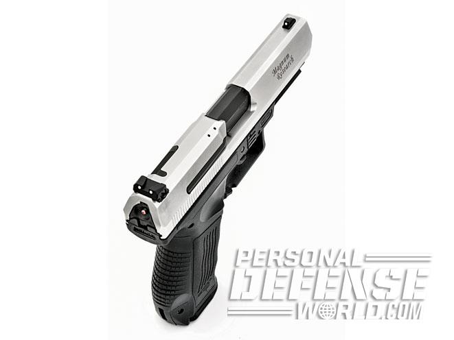 What Magnum Research brings to the table is the slide, barrel and exterior modifications. Of the latter are the elongated triggerguard and a longer, four-slot Picatinny rail on the dust cover. While both eliminate the use of most P99 holsters, the triggerguard is more than amply sized for use with gloves, and the longer rail provides more room for light/laser combinations than a Walther. And, of course, a barrel nearly half an inch longer increases accuracy while the overall slide length extends the sight radius. In terms of capacity, all Walther magazines (and extended-capacity magazines for the P99) are interchangeable, as are all Walther P99 accessories.