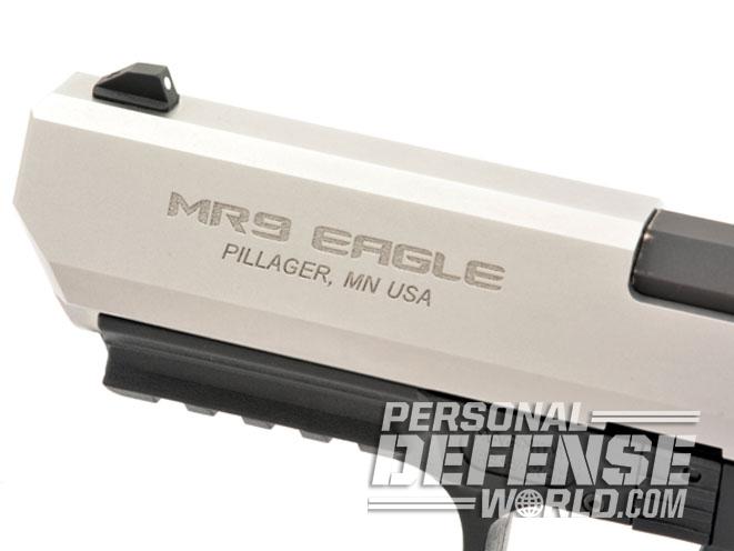 The MR9 offers the same 15+1 capacity in 9mm and 11+1 in .40 S&W, and it comes in a two-tone finish. All of that remains unchanged on this latest MR9 version. What’s different is the addition of a Desert Eagle slide.