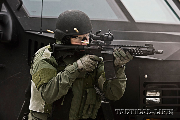 The PDW from Troy Defense is a 5.56mm-caliber rifle with a 14.5-inch barrel that measures 20 inches in overall length with the six-position PDW stock collapsed. The action is semi-auto or select fire via direct gas impingement. The upper receiver is an M4A4-type flattop with a PDW 11-inch Alpha Rail handguard that has folding rear and front sights. The lower is outfitted with a BattleAx Control Grip and an oversized triggerguard. It includes three Troy Battlemags, a sling and cleaning kit. For more information, visit troydefense.com or call 413-788-4214.