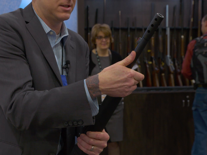 The Ridge Runner features an integrated rail for mounting a scope or reflex sight, a Skinner rear peep sight, a fiber-optic front sight and a removable muzzle brake. The 18.5-inch, half-octagonal barrel and receiver are matte black (hard chrome is also available) while the wooden stock and forend are covered in black “Soft Touch” rubber for enhanced comfort and control.