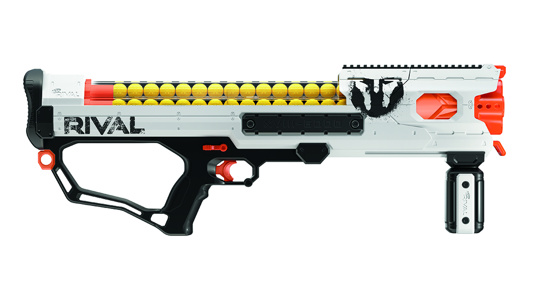 The Nerf Rival Hades XVIII-6000 blaster holds 60 high-impact rounds in an easy-load integrated magazine. Simply prime and pull the trigger. Package includes blaster, 60 high-impact rounds and two flags. MSRP is $69.99.