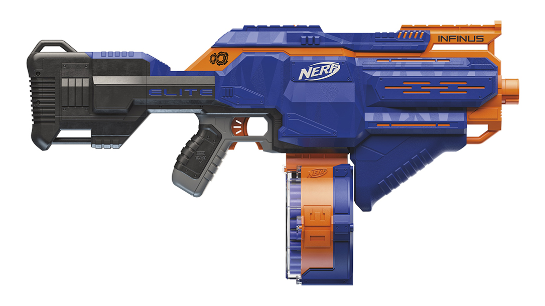 The big feature on Nerf’s N-Strike Elite Infinus blaster is a 30-dart removable drum. The Infinus also features motorized Quick-Load Technology. As users feed darts into the blaster, the darts are automatically loaded into the drum. An acceleration button powers up the Infinus, then users simply pull the trigger to fire. The Infinus includes 30 Elite darts. MSRP is $69.99.