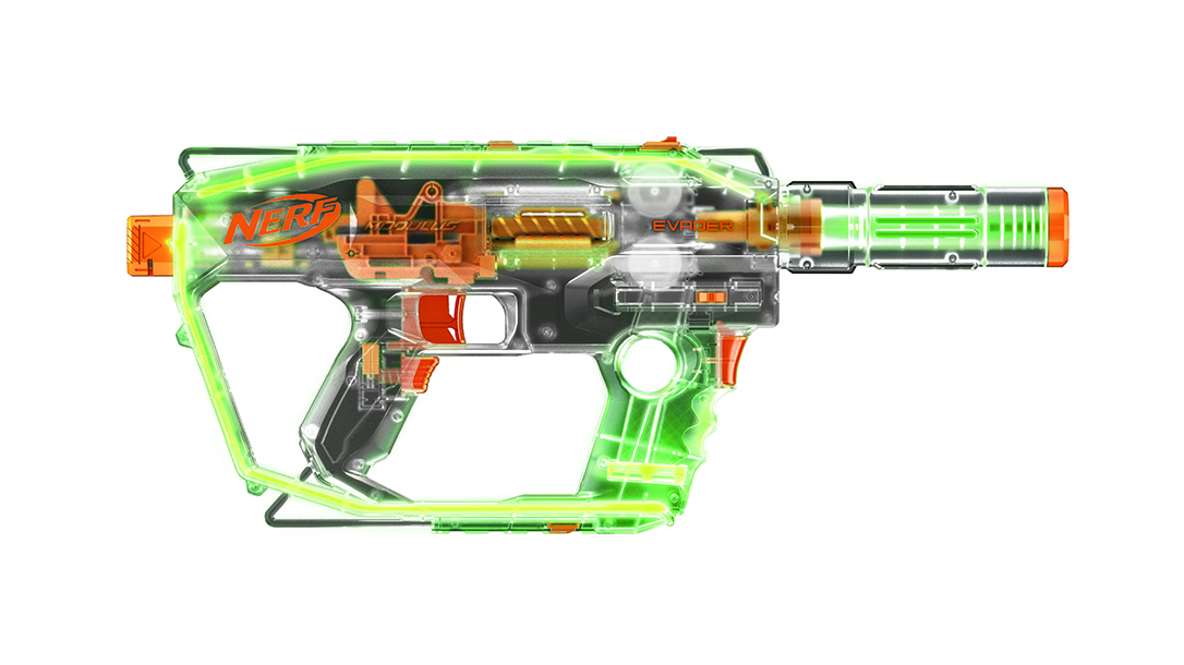 The Nerf Modulus Ghost Ops Evader blaster was built with stealth in mind. Part of the Ghost Ops series, the Modulus Evader is completely clear to keep shooters undetected. Users can illuminate the blaster to guide the way in low-light situations by pressing the light activator. There is also a customizable barrel extension, which lights up when attached to the blaster. The Modulus Evader uses a 12-dart clip, which can be rapid fired via its motorized technology. The package includes blaster, clip housing cover, barrel extension, 12-dart clip and 12 darts. MSRP is $39.99.