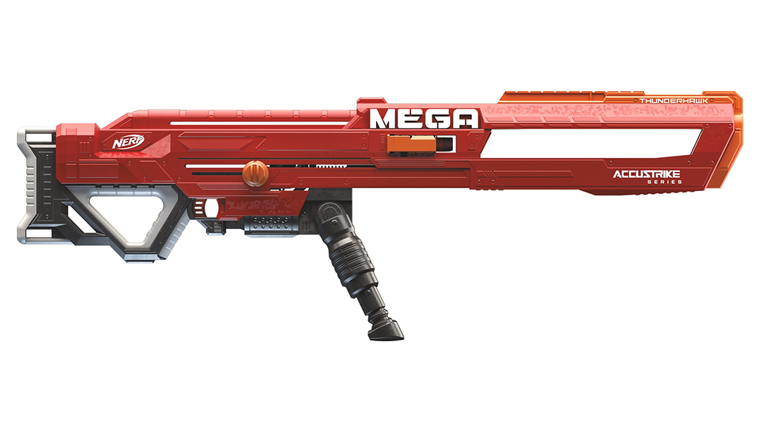 The precision-based Thunderhawk is Nerf’s first ever Mega Accustrike blaster. A barrel extension slides back and forth on the top of the blaster for custom performance allowing for distance targeting or a more compact blaster. The Thunderhawk allows for steady shots with the flip-down bipod for added accuracy. The Thunderhawk blaster includes a 10-dart, side-loading indexing clip and 10 Nerf Mega Accustrike darts. It is also compatible with Nerf Mega darts. MSRP is $49.99.