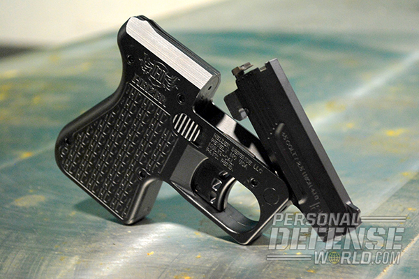 The ultimate backup thundergun, the Heizer PS1 stainless steel pocket shotgun offers users .410-gauge power in an easily concealable yet heavy-duty package. A break-top action single shot, the PS1 accepts both .45 ACP pistol rounds and 000 buckshot .410-gauge shotshell. A quick-release lever opens the action, and an internal extractor raises the spent shell for a quick reload. Space is provided inside the grip for storing two additional rounds. The PS1 is available in desert tan, black, brown, pink and polished stainless steel (heizerdefense.com).
