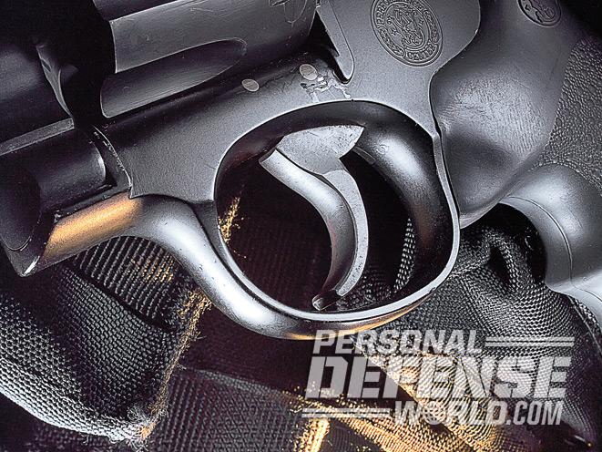 The grip frame is the universal round-butt K-Frame profile fitted with synthetic-grips with the S&W logo and “pebbled” side panels. Everything else on the M&P R8 is typical of the modern Smith & Wesson revolver. The firing pin is mounted in the frame, the cylinder stop is integral to the frame, there’s a redesigned cylinder-release latch, the inclusion of a keyhole for the internal safety/security lock, plus the extractor star has offset arm tips that keep it locked in place. The hammer has a medium-width spur that’s checkered for a good thumb purchase, and the trigger is wide and smooth-faced, which makes the already smooth Performance Center action feel even smoother.