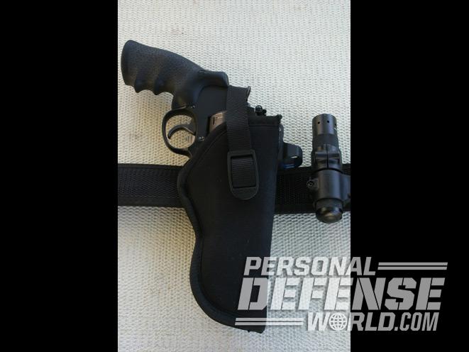 I don’t know of any holster that will accommodate the M&P R8 the way I have it set up. As an exercise in curiosity, I did a little experimentation and it occurred to me that a simple and inexpensive Sidekick holster from Uncle Mike’s would work given a little tweaking. I selected a Model #2, the size of which worked well for this N-Frame, 5-inch-barreled revolver. It’s a given that the gun will not fit in the holster with the RLS light attached, but in two seconds the light is off and clipped to the belt near the holster and can be quickly re-attached if needed. I cut a slot in the top of the holster, in front where the rear sight would usually be—this slot allowed me to keep the reflex sight in place on the gun. Next, I cut part of the seam on the back of the holster, near the muzzle. This 1.5-inch cut allowed the gun to be holstered with the LaserLyte laser sight unit in place on the lower rail. As the holster seam is lock-stitched, the remainder of the sewn seam did not unravel. This is not a fast-draw rig, just a means to carry the gun on the belt if need be, and the safety strap on the holster keeps the weapon secure.