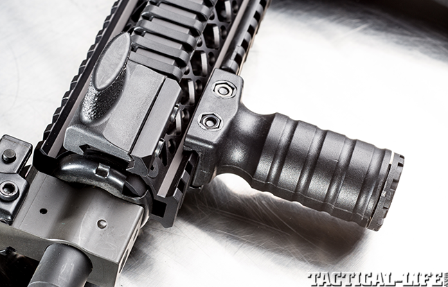 Designed for improved weapon control and to avoid burning your hand on the handguards, the BlackHawk Rail Mount Vertical Grip attaches to the handguard’s rail with two clamp screws. The reinforced polymer part can be used as a stubby or you can attach a 1.5-inch extension for a full-length grip. There’s also a storage compartment that seals with an O-ring, which is perfect for storing optics batteries.