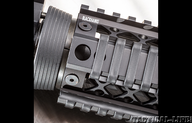 For its intended use as a defensive house gun I needed to be able to add a light to my rifle, and the easiest way to do that was to add a BlackHawk railed handguard. The two-piece, aluminum handguard easily replaces the issue plastic handguards. One unique feature of the BlackHawk product is its steel inserts, which guarantee rigidity even after a great deal of use. There are also four setscrews to unitize the two halves and eliminate any movement. This is especially important if you’re using a laser designator so that your point of aim/impact does not shift. BlackHawk vents its handguard to dissipate heat, and I like the part’s slim profile, which reduces hand fatigue during extended range sessions or perimeter duty. I also used BlackHawk’s rail covers, which fill the gaps in the Picatinny rail rather than covering them and making their outer diameter uncomfortably large. BlackHawk’s rail covers come in 18-slot lengths and can easily be cut to the desired length.