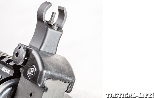 With its given mission as a home defense gun, my intention was to mount an EOTech holographic sight as the primary optic on this gun. But I also wanted to include backup iron sights. The S&W M&P15OR is a flattop, 16-inch-barreled carbine with a railed gas block. BlackHawk makes both front and rear sights that lock solidly into their stowed positions out of the line of sight of the optics, yet they deploy instantly thanks to spring pressure. The sight housings are made from molded polymer for an optimal strength-to-weight ratio. The rear sight uses a single “hybrid” aperture that’s machined from aluminum, while the front sight is steel and can be adjusted for elevation in the traditional manner. A semi-circular hood protects the front sight post. When combined with the rear sight, the set makes for a quick and easy-to-see sight picture.