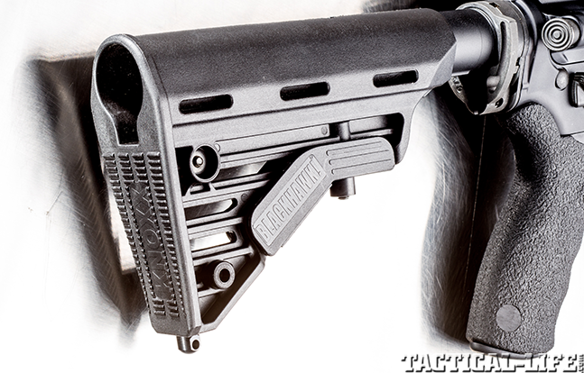 My S&W M&P15OR carbine uses a standard M4-style collapsing buttstock and has a commercial receiver extension, or buffer tube as it is more commonly called. To remove the buttstock, I depressed its release lever and pulled it to its most rearward position. By pulling down on the lever pin, the stock can be pulled completely off the tube. At this point I added BlackHawk’s AR-15/M4 Ambi Sling Adapter. Unlike most other manufacturers’ designs, this part does not require the removal of the buffer tube’s castle nut. It slides over the tube and is tightened with the included wrench. With this part in place, I slid the new BlackHawk collapsing buttstock over the tube.