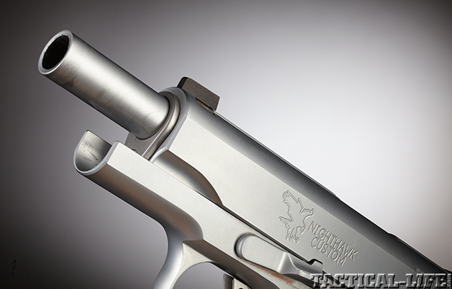 Starting with solid forgings, the slide and frame are cut in the company’s Berryville, Arkansas, facility, and my test model featured a hard chrome finish on both. The standard Talon II is fitted with a 4.25-inch, stainless steel barrel. My test pistol came with Nighthawk Custom’s National Match Carbon barrel expertly fitted to a stainless steel bushing. The pistol utilizes a standard Commander-sized guide rod and plunger, so the Talon II is easy to dissemble in the field—no tools are needed.