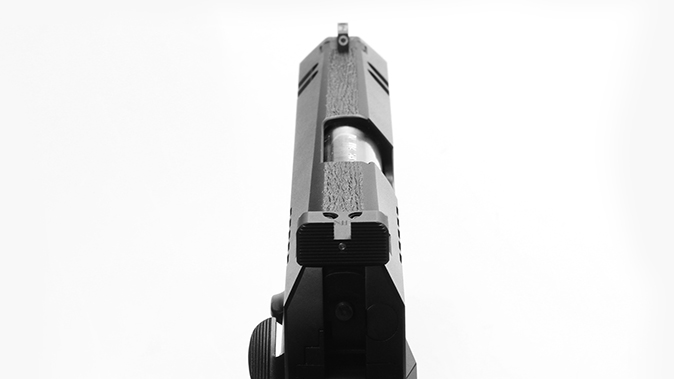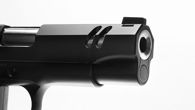 The ports tastefully show off the match-grade, stainless steel bull barrel, which has a deeply recessed crown flush-cut with the end of the slide. A full-length guide rod and bowtie plug keep the front of the slide very clean. In keeping with the theme, the slide was left void of all markings, and the sights include a tritium front and a Heinie Straight Edge Ledge rear unit.