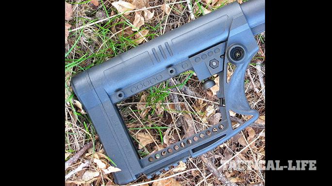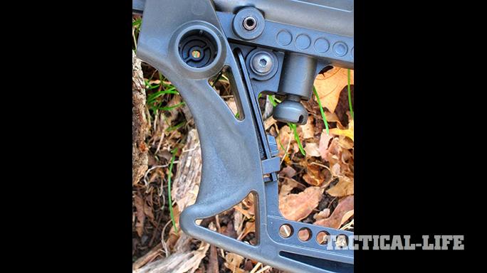 During shooting, the screws loosened on the lower front rail and the plate at the back of the sliding stock; it’d be good to keep an eye on those areas or apply some thread-locker. The Luth-AR stock itself was loose on the buffer tube out of the box, and it took a few minutes of analytical eyeballing (no instructions included) to notice the attached little 5/64-inch hex wrench in its recesses on the left side. Once you decide which stock extension slot you like, use this wrench to turn a small screw to lock the stock down tightly on the tube, after which there’s no more wobble. Collapse the stock for transport, extend it once you get where you’re going and lock it down for the rest of the session or excursion.