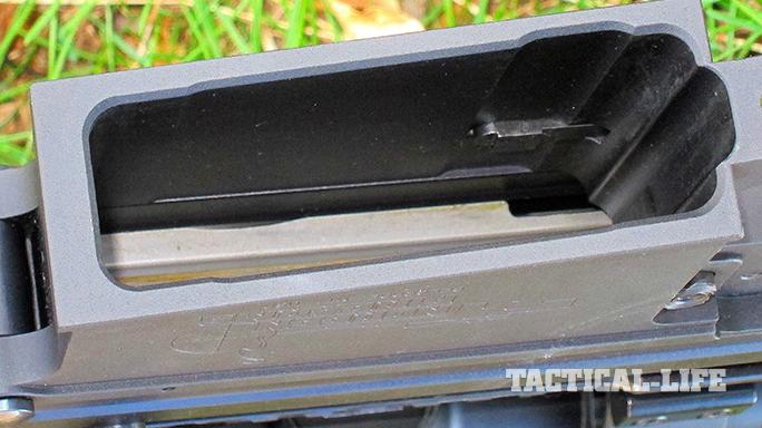 I like the charging handle in operation—it’s much handier than the AR’s T-job—but it does necessitate a slight change in the breakdown process for cleaning, and you’re not going to do it in the field without a tool. The upper and lower receivers separate the same old AR way by pushing the two takedown pins sideways, but obviously the carrier assembly can’t slide out the rear of the upper with the handle stopping at the end of its travel track cutout. To pull the carrier, you’ll need a 3/16-inch hex wrench to back out the screw and remove the handle, after which the carrier group will slide out. From there, disassembly and cleaning is the same. Another tip: Make sure you tighten the charging handle hex screw down tight when you reassemble the gun. If you don’t, you know Murphy’s Law dictates that it’ll loosen up during firing, and you can’t run the gun without the handle if it flies off into the brush.