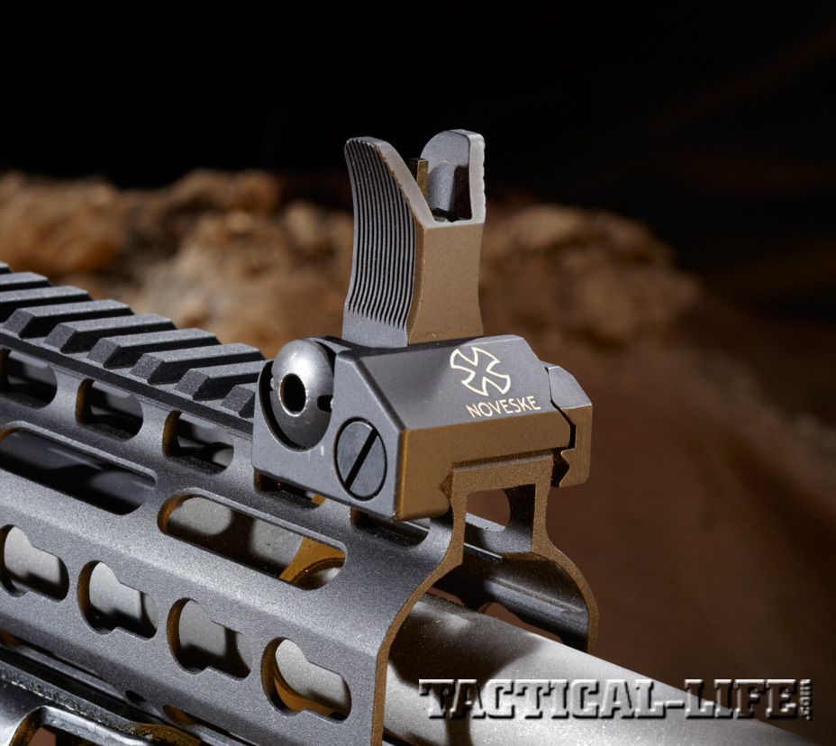Housed within this unique handguard is what Noveske considered the heart of an AR—the barrel. The 18-inch stainless steel barrel has a 1-in-8-inch twist rate, and the chamber is cut to 5.56mm NATO dimensions with extended feed ramps. The barrel has a bead-blasted finish, and the muzzle has ½-28 threading for easy suppressor attachment, and a thread protector is provided with the rifle. A low-profile gas block supporting an intermediate gas system is pinned to the barrel, hidden under the svelte handguard.