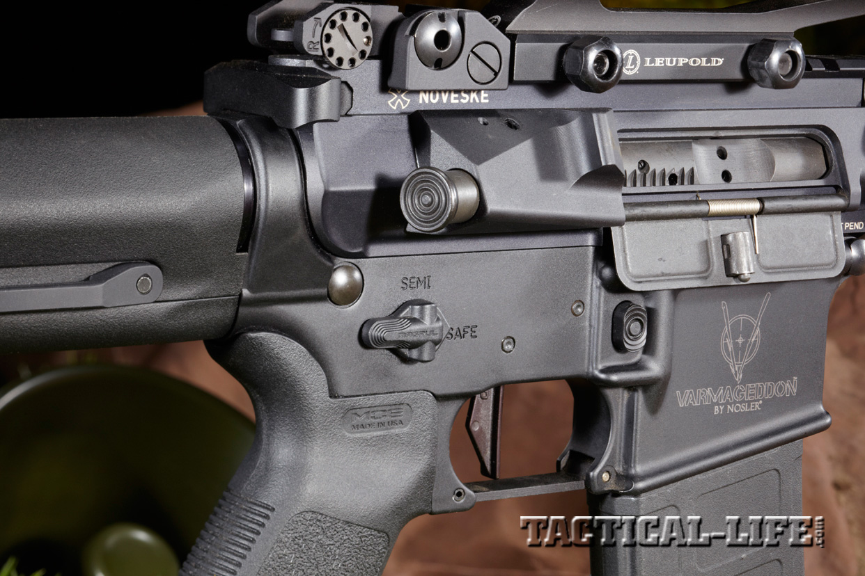 But, believe it or not, that’s not the full description. As with the company’s custom bolt-action line of rifles, Nosler offers the rifle as part of a complete package, so the Varmageddon AR is shipped in a soft-sided case with an exterior side pocket that includes one 20-round Magpul PMAG and one 30-round PMAG, a Leupold Mark 2 IMS scope mount, a two-point quick-detach sling, a quick-detach bipod mounting stud, a Harris 6-to-9-inch bipod, one KeyMod 3-inch Picatinny rail section and two 20-round boxes of Nosler Varmageddon 55-grain ammunition.