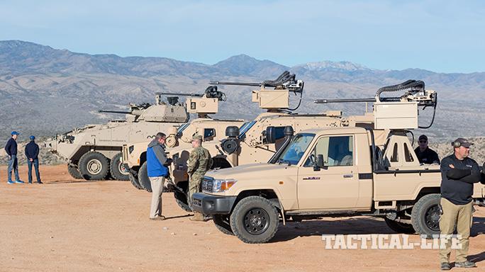 The pièce de résistance of the event came when Orbital ATK unveiled a Toyota LC79, which is essentially a Land Cruiser pickup truck. But the difference here is that an M230LF chain gun was mounted in the back. The entire system was remotely operated by a technician in the passenger seat. As the truck rolled up the road, it engaged multiple targets and turned them into dust and flames.