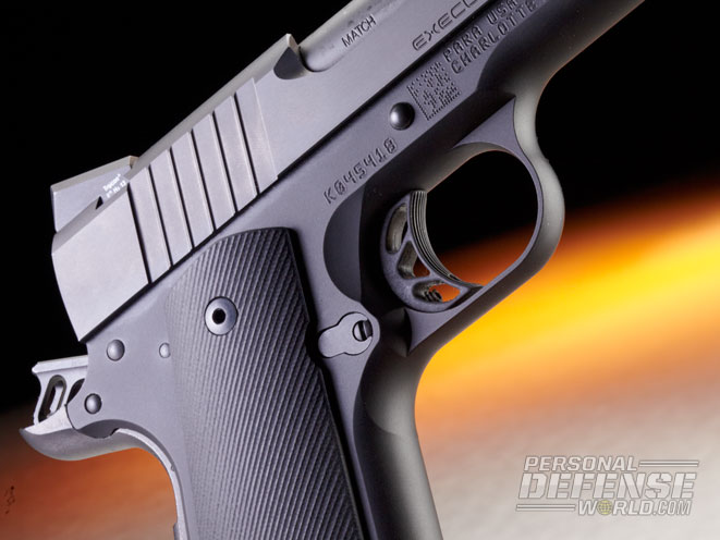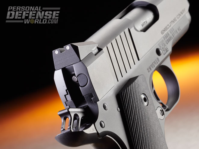 The first thing you notice about the Executive Carry is the uncanny sense of balance. The leggy 1911 grip frame, fitted with machined VZ grips matched to the angle of the Ed Brown Bobtail mainspring housing, sits firmly in the hand. The lower profile of the rounded palm swell grip safety also melds smoothly into your grasp, and the Para points naturally. Even with the very short sight radius, the ramped Trijicon night sights are easy to acquire under all lighting conditions and were right at point of aim (POA) at the range test distance of 15 yards. The Executive Carry’s heavy duty recoil system and guide rod design make recoil more manageable, but the slide demands greater effort to cycle when chambering the first round or clearing the gun. It’s a fair trade-off as this proved to be one sweet .45 ACP to shoot.