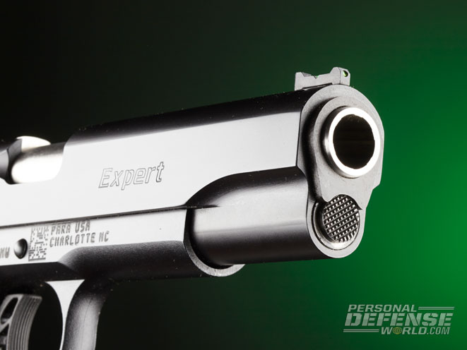 A stainless steel, match-grade barrel is used on the pistol. It is of standard configuration, not of the ramped or supported variety. Para throats the chamber mouth from ear to ear for optimum feeding reliability, and the frame’s feed ramp is equally well polished to this same end. During my evaluation I used a variety of defense loads, full metal jacket (FMJ) rounds as well as lead target loads and reloads, all with different overall lengths and bullet nose configurations, and the Expert digested them all without fail!