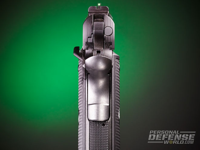 I first got my hands on the pistol at Gunsite Academy in Paulden, Arizona, where I shot a number of drills with it and put 20 to 30 magazines of ammo through the gun. What impressed me immediately was its fluorescent green front sight, which glows in daylight and is extremely easy to pick up. The rear sight possesses a wide notch for a quick and unimpeded sight picture. It also has an extended thumb safety, a beavertail grip safety and a crisp trigger. All of these features are absolute “must haves” for someone who wishes to compete with a 1911.