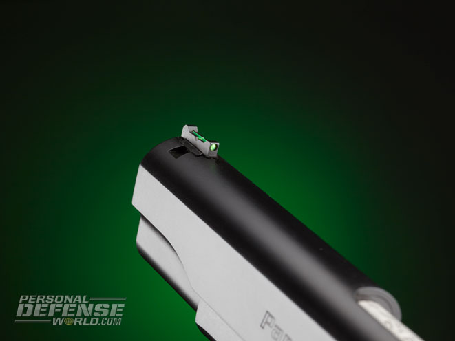 The Expert’s slide features a lowered and flared ejection port. This allows empties to exit the gun unimpeded, and since most competitors are also reloaders, it also ensures that the empty cases are not damaged or dented as they exit the gun. A standard internal, or original style, extractor is fit to the Expert, and the frame uses an extended ejector. The front sight is dovetailed in place and has a fluorescent green optic rod. In sunlight, these types of sights glow bright and help the shooter pick up the front sight. Its rear sight is also dovetailed into the slide and is drift adjustable for windage. Para cuts the rear sight notch wide and square so there is plenty of daylight on both sides of the front sight for quick alignment.