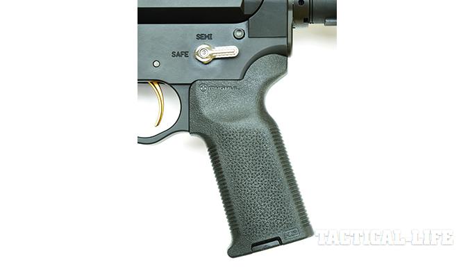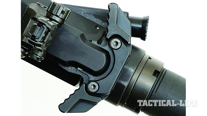 The barrel uses a mid-length gas system and is fitted with an adjustable gas block and VG6 Precision’s Epsilon muzzle brake. Surrounding the barrel and gas system is a 12.63-inch, free-floating Midwest Industries G3 M-Series handguard with a long Picatinny top rail and M-LOK slots along the sides and bottom. The upper is also fitted with a lightweight forward assist, ejection port cover and rod. A Griffin Armament charging handle is also included as well as a titanium bolt carrier. An enhanced JP Enterprises bolt with an improved extractor, ejector and gas rings is installed for increased durability and reliability.
