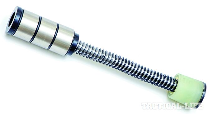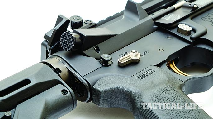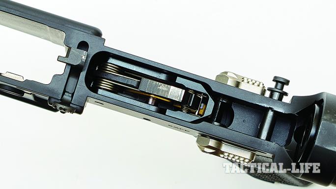 The lower receiver’s takedown and pivot pins, magazine release and ambidextrous safety selector all made from titanium. The mil-spec carbine buffer tube, attached to the lower with a titanium castle nut, houses a JP Enterprises Silent Captured Spring System. The buffer retainer and end plate are also made of titanium.