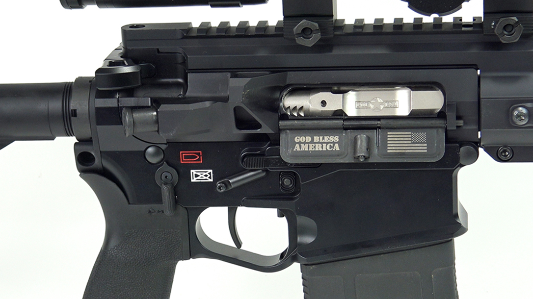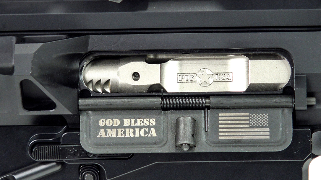 The bolt carrier group used in the Revolution is essentially the same one used in the company’s 5.56mm guns, with only slight modifications to manage .308 rounds. It is a one-piece, NP3-plated bolt carrier made with the mechanical key built into the body and positioned behind the cam pin. This design helps reduce carrier tilt. The unit also features a chrome-plated bolt extractor and firing pin for smooth functioning and enhanced corrosion resistance. But that’s not all—there’s another bolt carrier group component that needs a closer look. POF-USA’s patented roller cam pin is very nice, as it was designed to reduce friction and drag in the action, and it absolutely excels in that regard. The NP3-coated roller head actually rolls inside the channel of the upper, thus eliminating friction and prolonging the life of the upper.