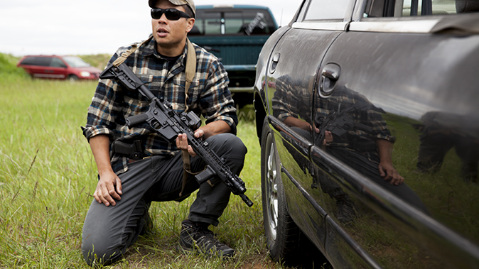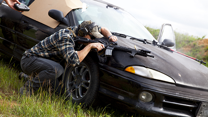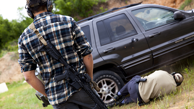 “I thought that the first thing you’re supposed to do behind a vehicle is to start shooting underneath the wheel assembly. This worked great against cardboard. But during force-on-force training, if the threat saw me, they’d run up on my position and I was stuck on my back.”