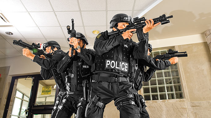 Dynamic decision-making or confrontation simulation training takes the officer/student off the firing line and places them in scenarios against live role-players. Marking cartridges such as Simunition FX, ATK Force on Force or UTM cartridges can be used. Although these options are more expensive than airsoft, the realism is well worth the price. These inert marking cartridges fire out of pistols or carbines at about 400 fps and leave a star-shaped paint “mark” on the target. As long as role-players are outfitted with protective clothing, these cartridges provide invaluable training.