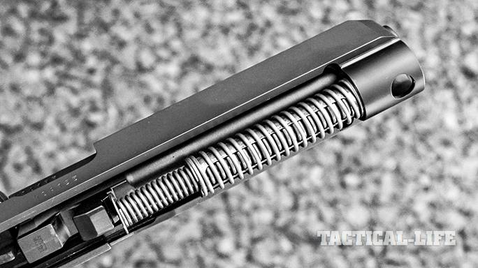 The G41 Gen4 strips down like all GLOCKs. After making sure it’s unloaded, retract the slide a fraction of an inch, pull down on the takedown lever and pull the slide free from the frame. Field-stripping reveals the dual recoil spring assembly. This setup helps mitigate felt recoil.
