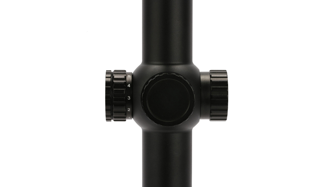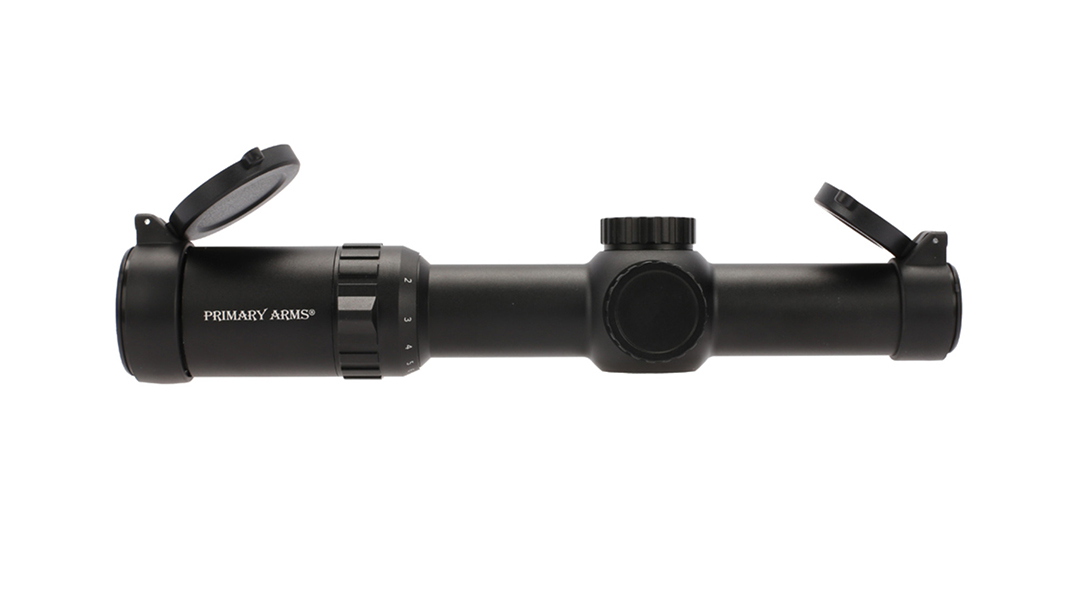 The 1-6x24SFP is Primary Arms’ best-selling low power variable optic. It features red reticle illumination, a fast focus eyepiece, and finger-adjustable windage and elevation knobs. The reticle illumination is provided by a single CR2032 battery, which is included. A spare battery is also located inside the windage turret cap. A total of 11 settings take the reticle up to “daylight bright,” Primary Arms claims.