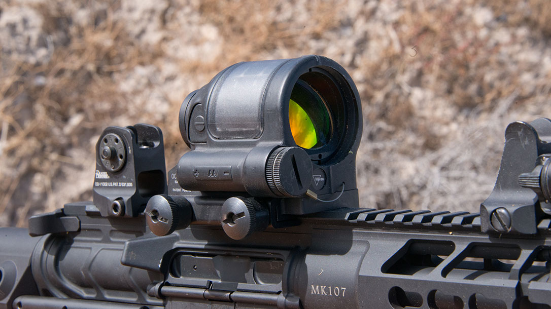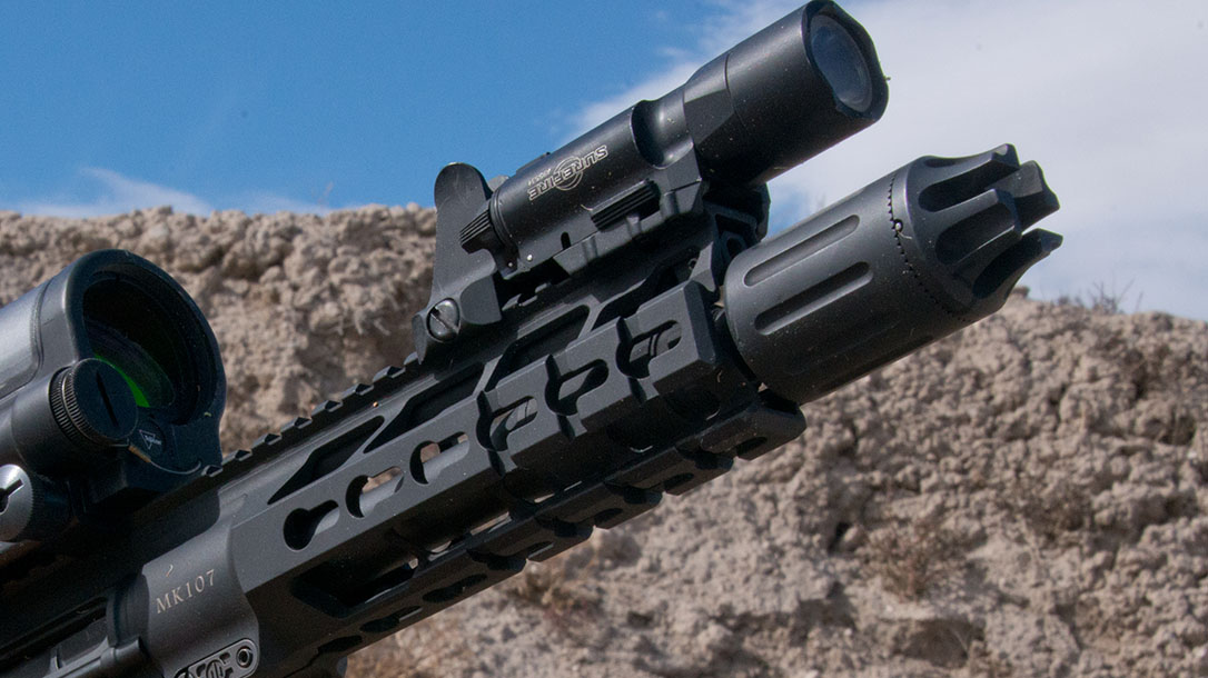 Make no mistake: The MK107 is still loud—just not to the shooter. The CQB brake sends all of the blast forward, which shouldn’t affect even close teammates. But you’ll still notice it in a shoothouse, for example. Under normal rates of fire, the CQB does a good job of reducing flash, but rapid fire will occasionally produce a fireball. Of course, this is ammunition dependent, but physics still applies, and a 7.75-inch .223 barrel will leave plenty of unburned powder. You can also run the MK107 with a sound suppressor, but more gas will be blown back into your face. It’s certainly viable, but I’d prefer to just keep the CQB in place because it’s such a pleasure to shoot with on its own.