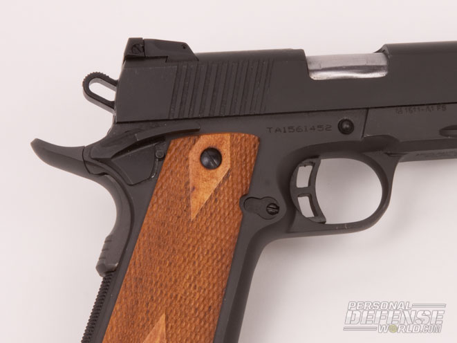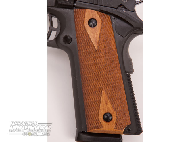 The grips are quite light colored, and they are checkered in the classic double-diamond pattern. The frontstrap has five deep striations to provide a little texture to help with a secure grip. The steel mainspring housing is deeply checkered. The checkering on both the wood and steel is quite aggressive. This gun sticks to your hand. I was a little concerned that, under .45 ACP recoil, it might feel like I was shooting a cheese grater, but that wasn’t the case. The checkering keeps the pistol firmly attached to your hand without ripping you up. The magazine well is beveled for easy reloads.