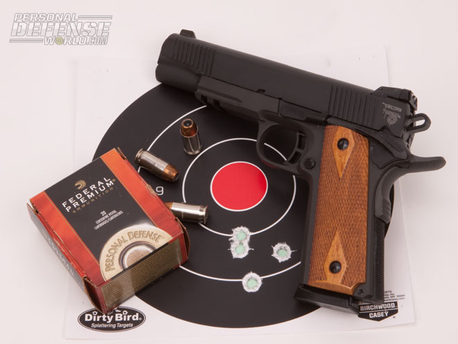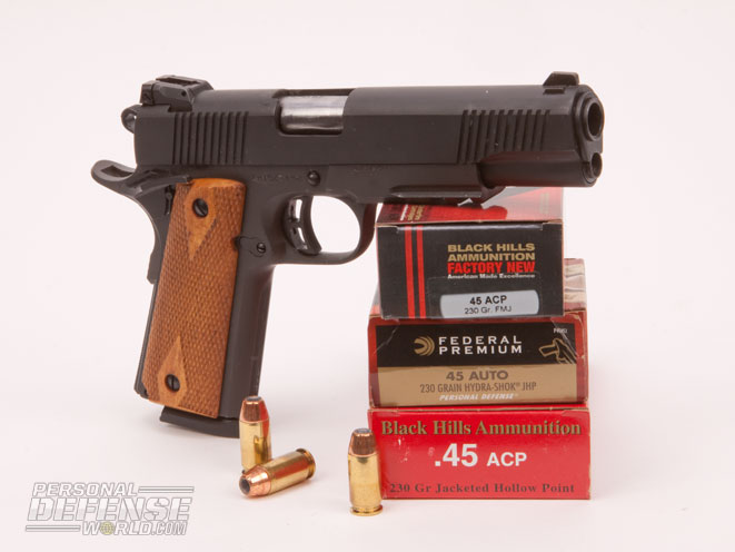 Taylor’s Tactical 1911-A1 proved to be a very accurate weapon. I tested it with two varieties of Black Hills .45 ACP ammunition as well as with Federal Hydra-Shok jacketed-hollow-point (JHP) rounds, and it shot all of them well. I started with Black Hills’ 230-grain full-metal-jacketed (FMJ) ammunition. Shooting the Taylor’s Tactical 1911-A1 from the 25-yard bench with the Black Hills full-patch ammo consistently delivered 2- to 3-inch-diameter groups. The velocity from the 5-inch barrel averaged 809 fps.