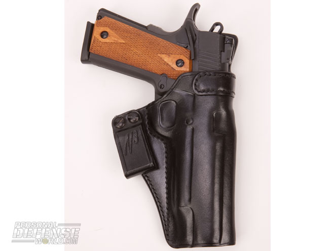 Forward of the triggerguard, the frame sports a Picatinny accessory rail. As I said, the rail is handy for mounting a light or a laser, but unhandy for holstering. Most holsters for standard 1911s will not accept a rail-equipped pistol, but I’ve found that the Galco N3 inside-the-waistband holster will accommodate this pistol without a problem. But, if you are buying a rail-equipped 1911, you probably intend to use it equipped with a laser or a light, and for that, you’ll need a specialized holster.