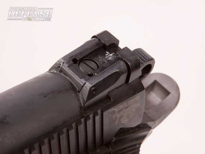 Besides the rail, the Taylor’s Tactical 1911-A1 is equipped with all the features modern shooters demand for a 1911. The ejection port is lowered and flared for reliable case shucking. Taylor’s Tactical 1911-A1 also has an adjustable rear LPA sight, and it’s a good one. It looks like a standard, Novak-style, no-snag fixed sight, but it is fully adjustable for windage and elevation. The front sight, dovetailed into the slide, is a blade with a slanted rear face. The rear sight has white dots on either side of the notch, but the front sight is all black.