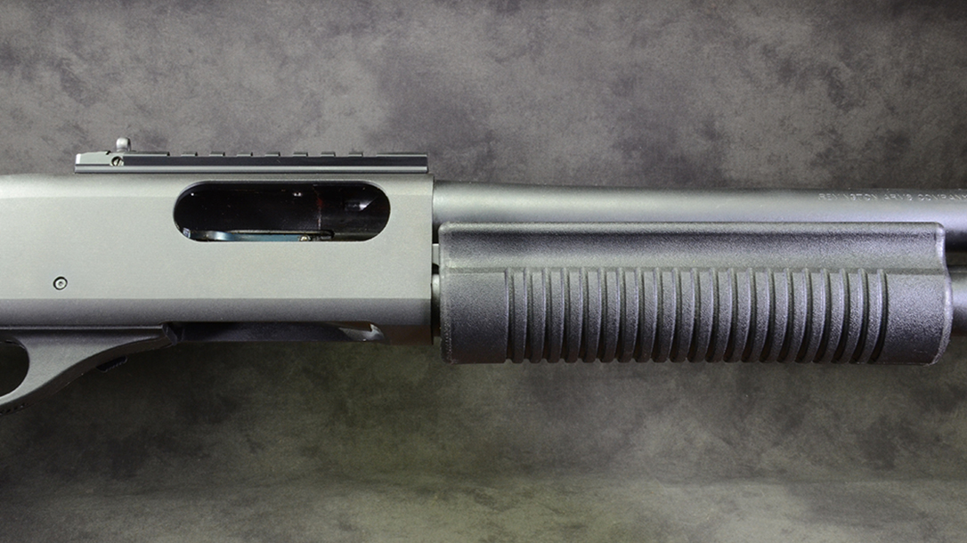 Although I own a couple of 870s, I did not have one with the Rem Choke system, so it seemed a good excuse to acquire an 870 Express Tactical. This shotgun is an excellent value, whether for law enforcement or personal-defense usage. It is chambered for both 2¾- and 3-inch shells and will take six rounds of either in its extended magazine. The barrel length is 18.5 inches, and it comes with an extended, ported Remington choke. An XS Sight Systems Ghost Ring sight rail is mounted on the receiver, with the ghost ring combining with the front post for fast sight acquisitions but also more precise shooting when desired. The ghost ring is adjustable for windage and elevation. The Picatinny rail allows you to mount a range of optical sights, though it is a relatively short rail, so an optic with a short base will be needed.