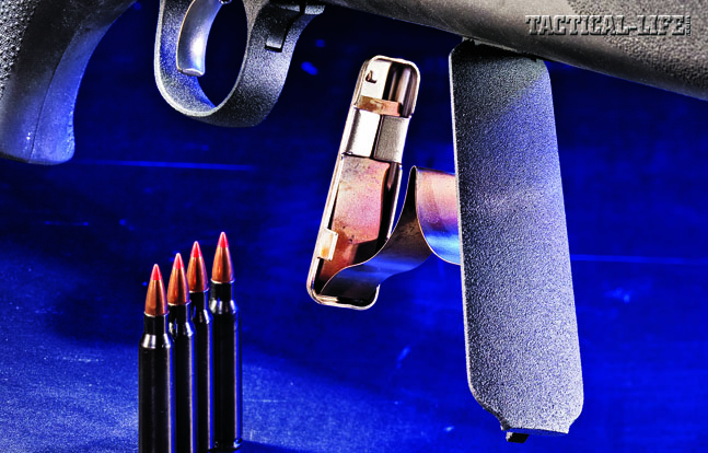 Of course, the Hogue stock wears a cushy rubber Hogue recoil pad that stays secure against the shoulder. Its effectiveness is not that noticeable with a .223, but with the other offered chambering, .308 Winchester, it has got to be nice! Lastly, there is a handy hinged-floorplate magazine.