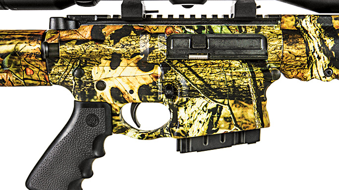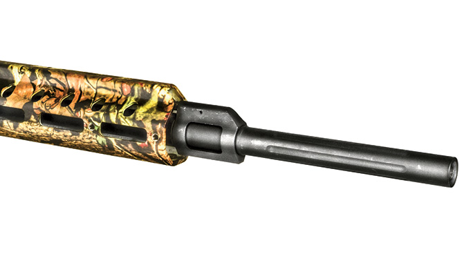 Finally, Mossy Oak Break-Up Infinity camouflage covers the buttstock, receivers and handguard. Other parts like the recoil pad, grip, ejection port cover, magazine, gas block and barrel may or may not come with the camouflage finish.