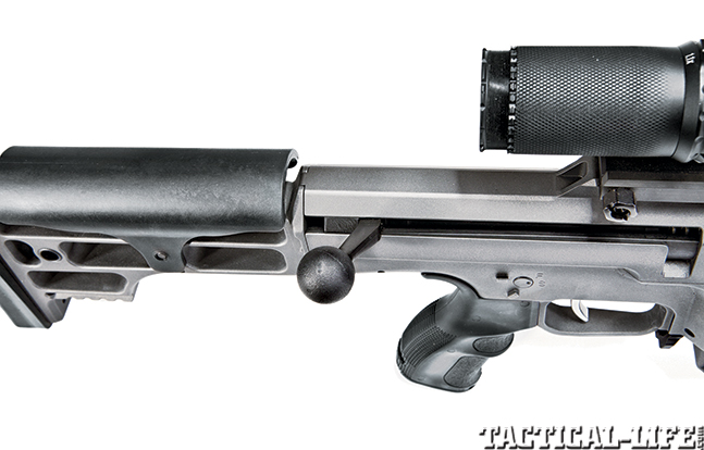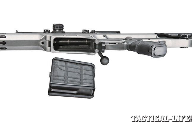 The 98B Tactical utilizes a polymer, 10-round magazine that is released via a toggle in front of the triggerguard; it’s easy to reach with either hand. The rifle also has one of the smoothest-feeding actions I’ve ever tested. The large bolt knob provides for easy manipulation in any condition, and the polymer bolt guide helps keep dirt out of the action.