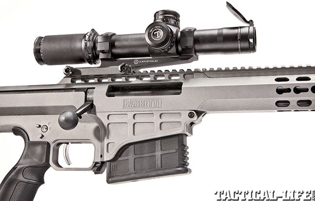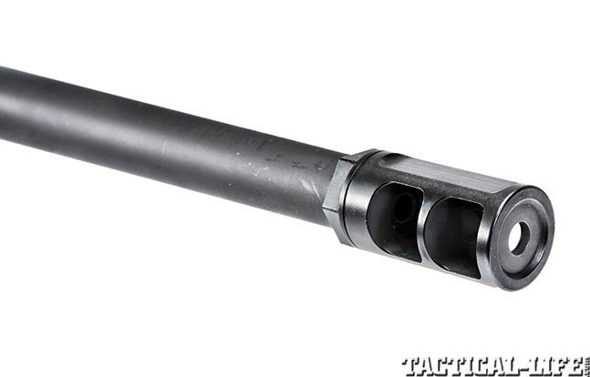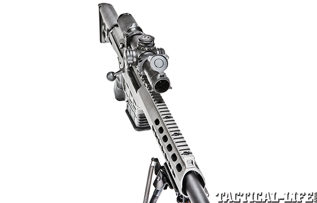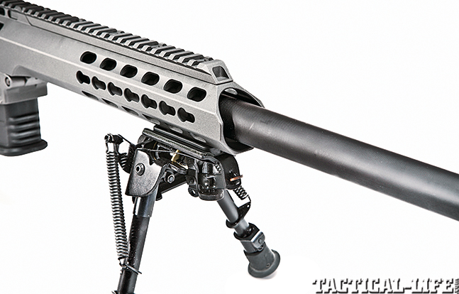 The exterior of the rifle is smooth, with no sharp edges. Instead of fixed rails, the handguard has KeyMod insertion points along the 3, 6 and 9 o’clock sides. The rifle also features a 17-inch-long top Picatinny rail with a 20-MOA offset for increased scope range. There is plenty of room to mount a large scope in conjunction with most night vision. The heavy, 24-inch barrel features a match chamber and a 1-in-10-inch twist rate. It is capped with a Barrett muzzle brake. Weighing in at around 11 pounds (unloaded), the 98B Tactical is light compared to other precision rifles in this caliber.