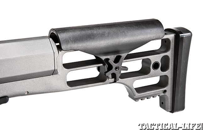 The stock design, combined with the muzzle brake, made recoil all but nonexistent. It felt similar to a typical 7.62mm NATO rifle. The buttstock’s bottom rail accommodated my rear sandbag perfectly, which made for some solid accuracy. None of my 100-yard groups fell outside 0.70 inches, with the best group measuring right at 0.5 inches. All grouping was done from prone using the supplied bipod. The best group came from RWS’ 190-grain Target Elite Plus ammunition, with the 190-grain Federal Gold Medal Match BTHP load a close second.