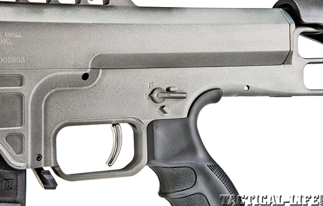 The trigger is adjustable, and it was crisp, breaking cleanly at about 4 pounds. The oversized triggerguard accommodates gloves or large hands. The pistol grip is comfortable, and any AR-style pistol grip can be installed.
