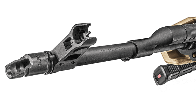 The AK-T currently starts life as a Hungarian parts kit, including the under-folding stock found on our sample. A fixed-stock version of the AK-T is also available. To the kit the company adds enough American-made parts to provide its finished AKMs with 922r compliance, even if an imported magazine is used. That’s a nice touch given the number of imported magazines floating around. The standard-profile, American-made barrel is hard-chrome lined, Parkerized on the exterior and has a U.S.-built, slanted flash suppressor.